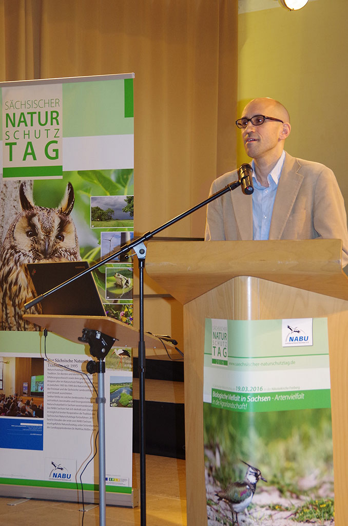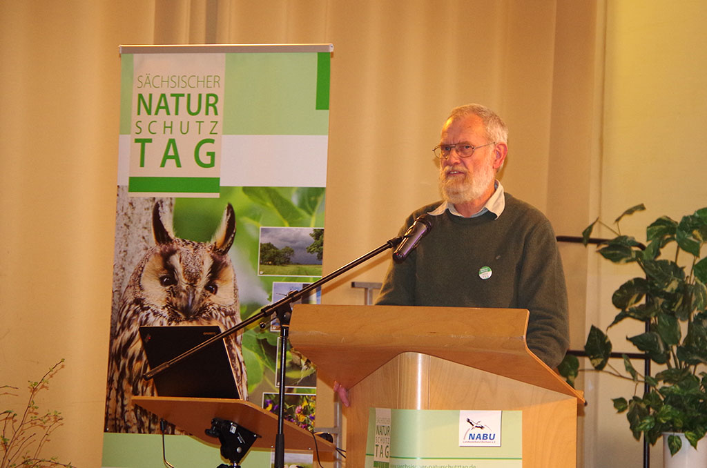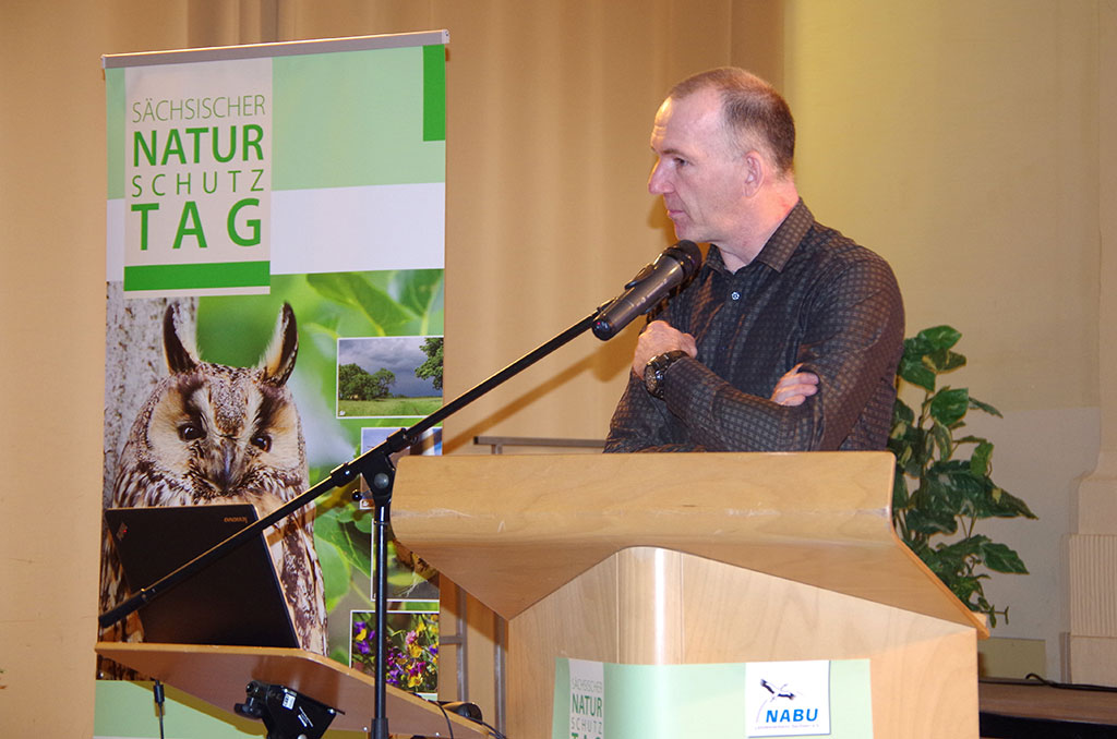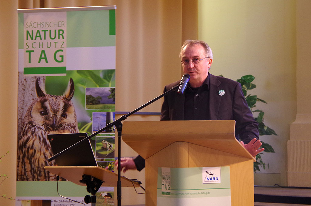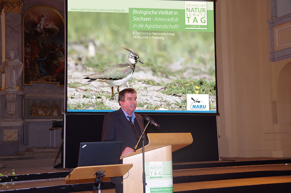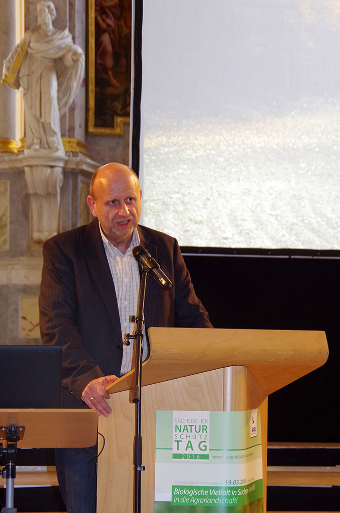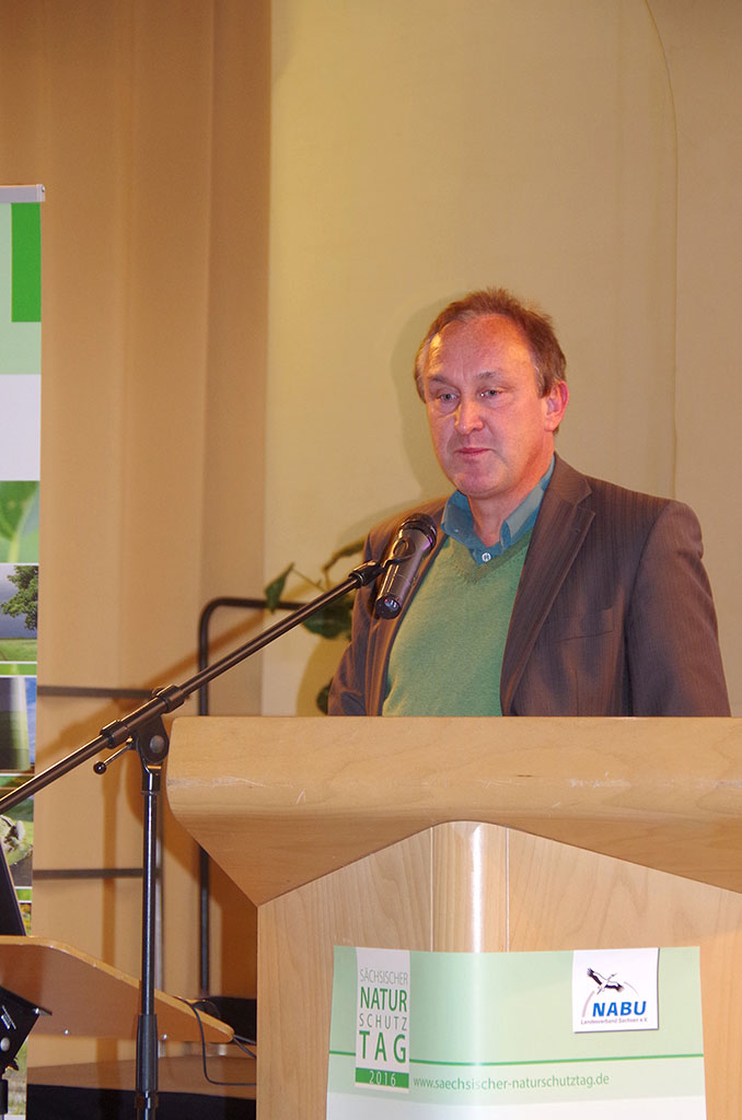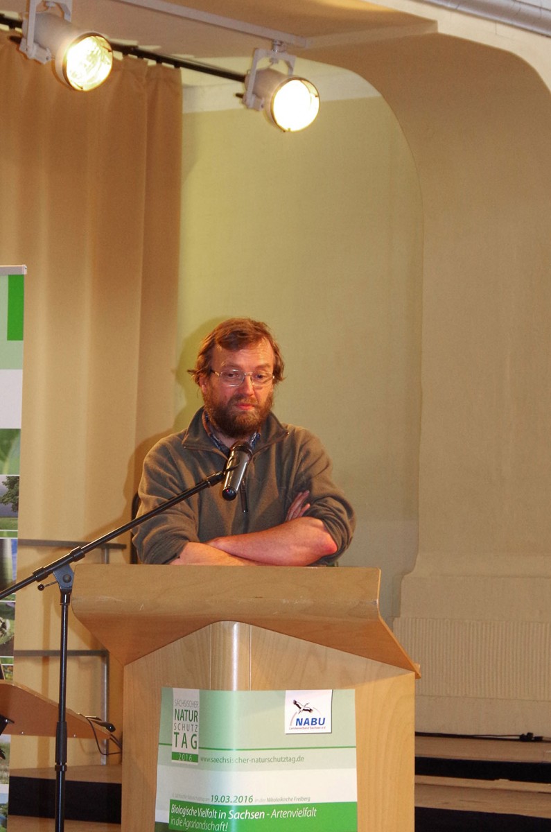 Begrüßt wurden die Teilnehmer vom NABU-Landesvorsitzenden Bernd Heinitz, der in seinen Eingangsworten betonte, dass die Landwirtschaft nicht nur eine große Mitschuld am Artensterben hat, sondern auch eine große Verantwortung trägt, die Biodiversität zu bewahren. Deshalb gehe es nicht darum, Landwirten die Schuld zu geben, sondern sie als Partner für den Naturschutz zu gewinnen. Er fordert eine Naturschutzoffensive, die strategisch und finanziell die Weichen für mehr Naturschutz in Sachsen stellt.